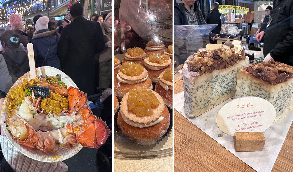 Bir akşam Borough Market’e gittik — atmosferiyle, reyonlarındaki ultramodern ve geleneksel lezzetleriyle tam bir gastronomi cenneti burası. Deniz ürünlü paella tadarken sokaktaki sesler, müzisyenler ve kalabalığın enerjisi ile birleşti; burası sadece bir pazar değil, yılbaşı coşkusunun bir parçası oldu.
