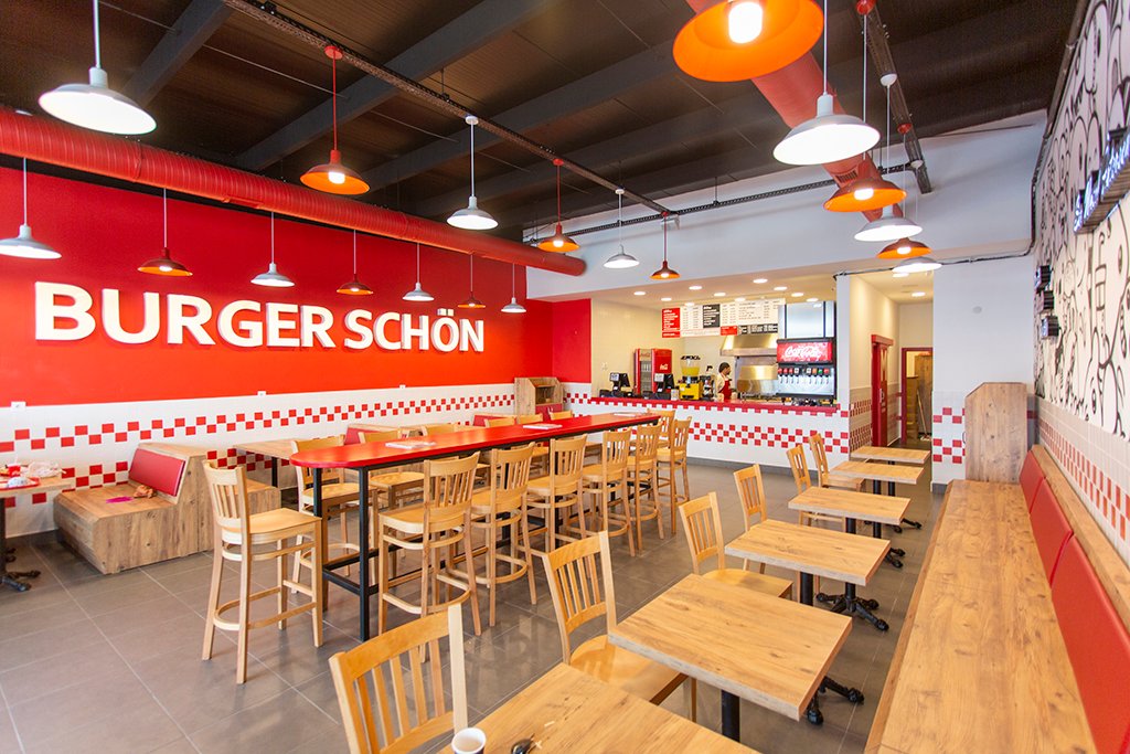 Kırmızı renklerin yoğunlukta olduğu, kıpır kıpır, enerjik bir hamburger dükkânından içeri girdiğimizde kendimizi bir anda mutfak kısmından gelen enfes kokuların peşinden giderken bulduk. Oldukça hijyenik bir mutfağa sahip olan Burger Schön’de klasik bir hamburgerden çok daha fazlasını yiyebileceğinizi aldığınız kokulardan anlayabiliyorsunuz. Self- servis sistemle hizmet veren aynı zamanda sade ama en iyi hamburgeri sizlere sunmak için gösterdikleri çabayı emin olun siz de fark edeceksiniz.